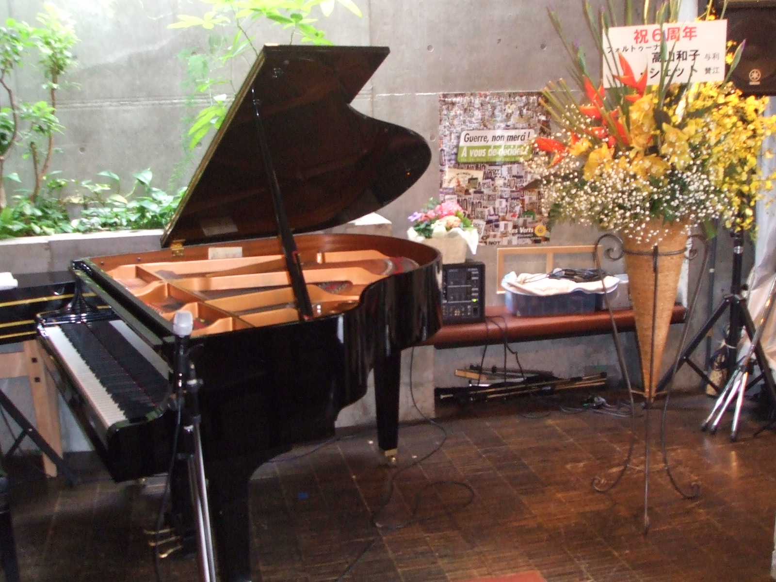 今日は会場にピアノをもう一台持込み、しょっぱなに全員でのセッション。なんとステージ下にもう一台がセッティングされているので、下でヤマハを弾いている私は、お客さんの目線と音響にありながら、演奏に参加しているという珍しいシチュエーション!