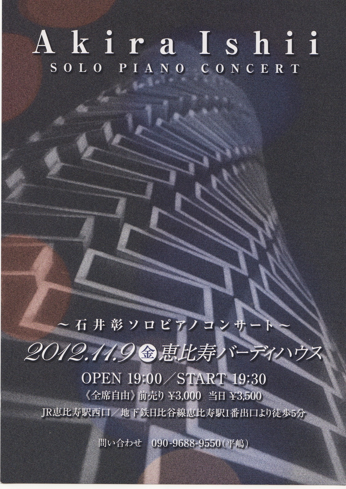 今年は、初めての会場「恵比寿バーディハウス」での開催です。晩秋の夜、都会の喧噪のトンネルを抜け、静寂の世界へいらっしゃいませんか?心に染み入るメロディーをお届けしたいと思います。ピアノはもちろん、スタインウエイです。