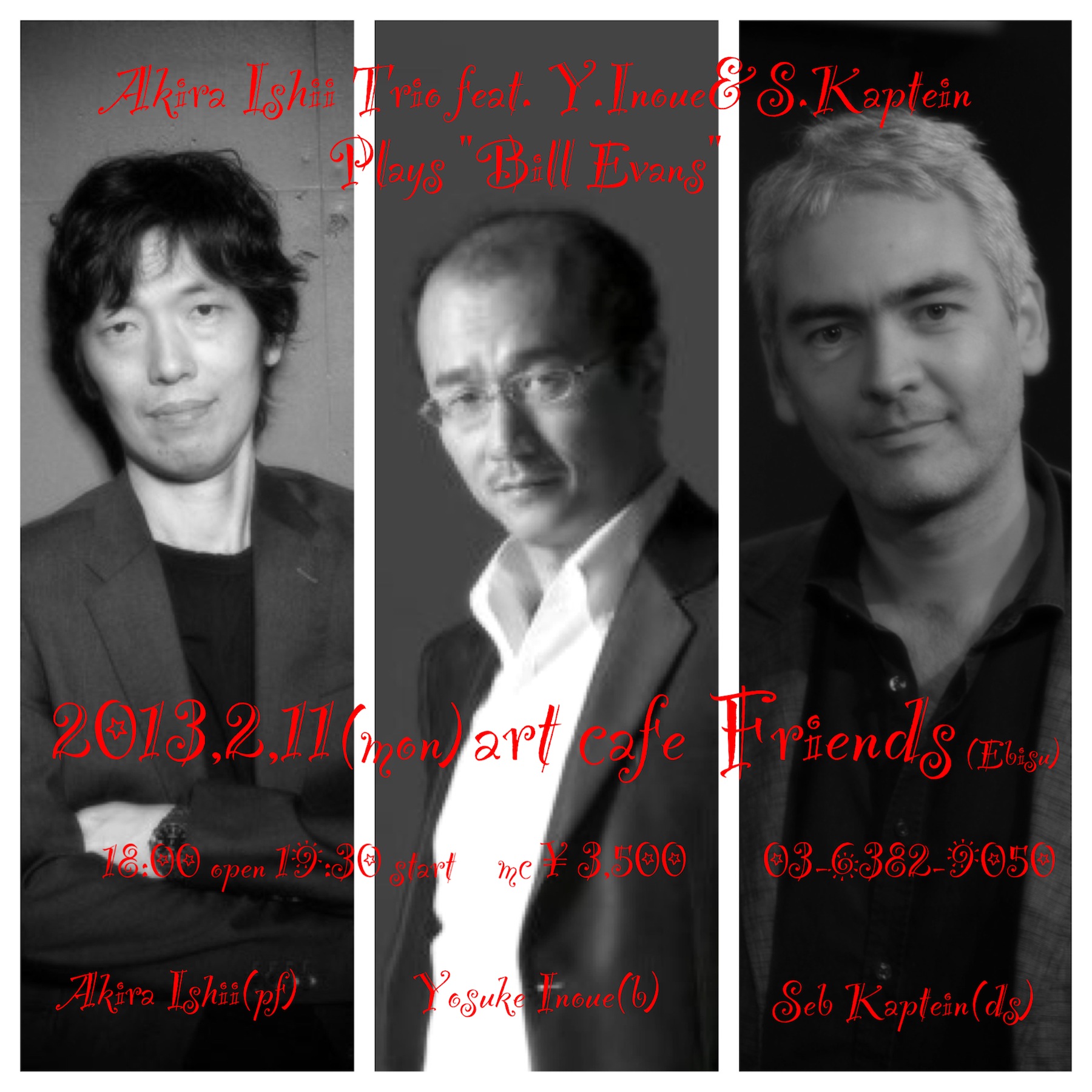 明日2月11日(月)はスペシャルトリオで恵比寿「アートカフェフレンズ」に出演します。30年来の付き合いの素晴らしいベーシスト井上陽介、ここ2年ほどで上京の度に共演しているオランダのスーパードラマー、セバスチャン.カプティーン。初のトリオを組みますが、『Bill Evans』に焦点を当てて演奏したいと思います。