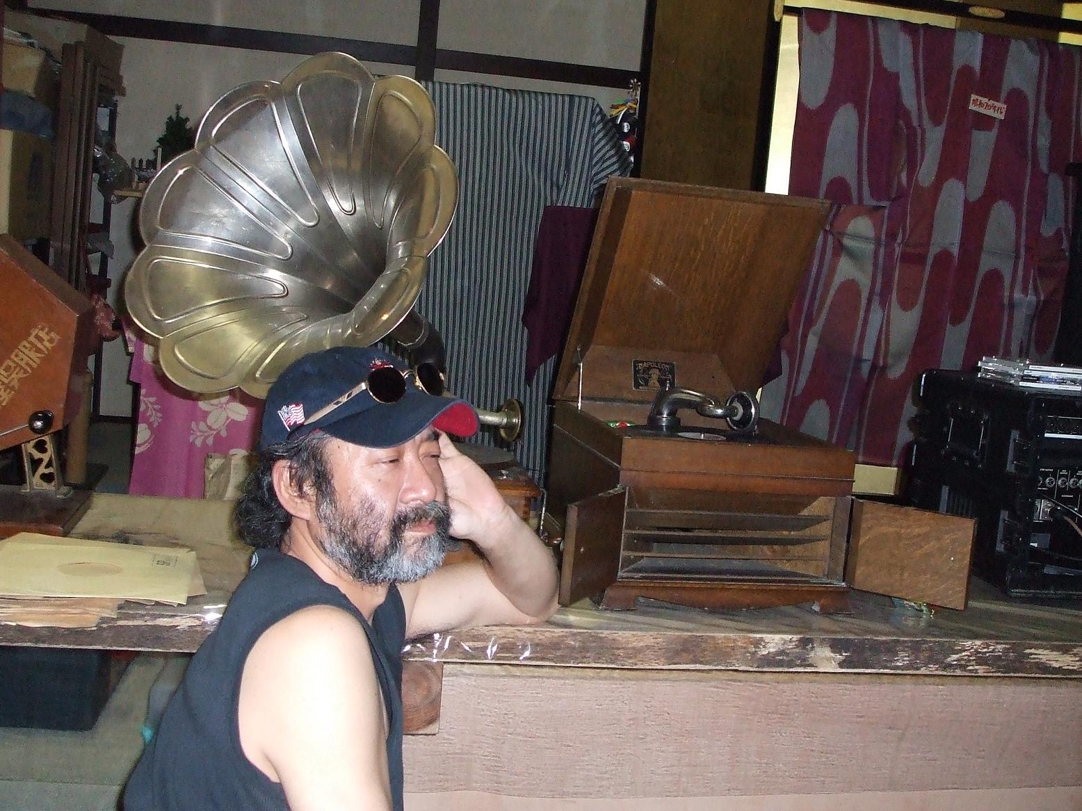 写真は蓄音機から流れる美空ひばりさんの歌声に聞き入り涙ぐむ金澤英明。