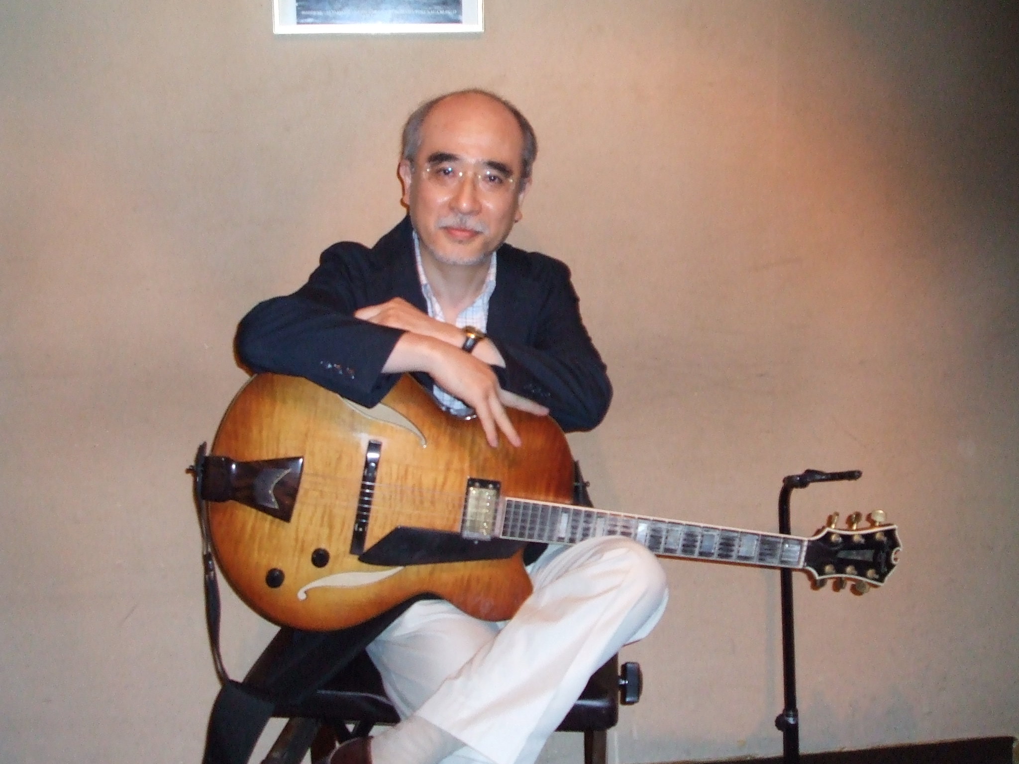 写真はライブ後、ステージにて愛器と共に粟澤氏。
